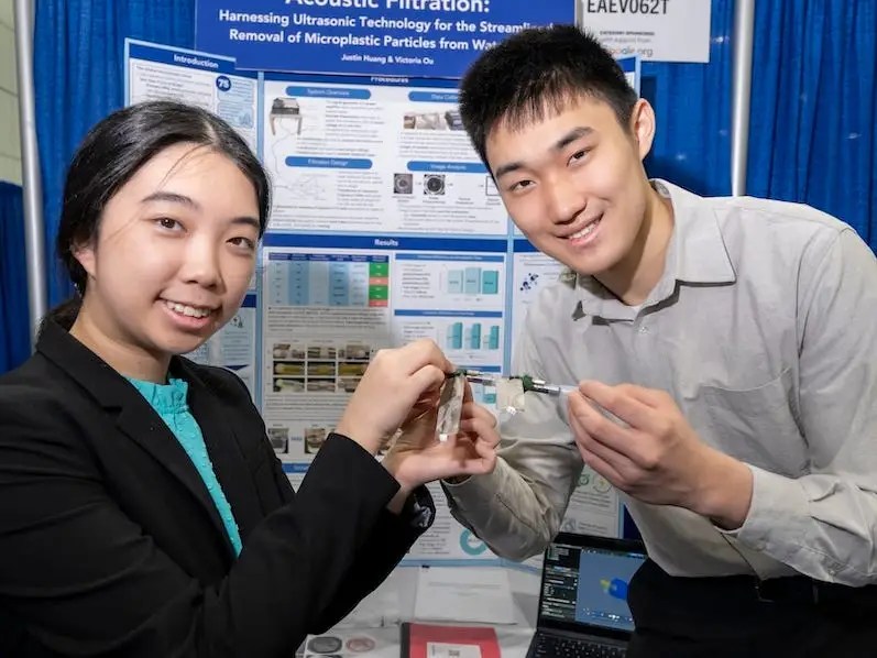 A pair of high schoolers invented a unique water filtration device that uses a wall of sound to hold back microplastic particles from running water. During lab tests, the high-frequency sound waves eliminated 84% to 94% of the suspended microplastic particles in one go. Using the reward money from a renowned prize enables them to scale up their invention.